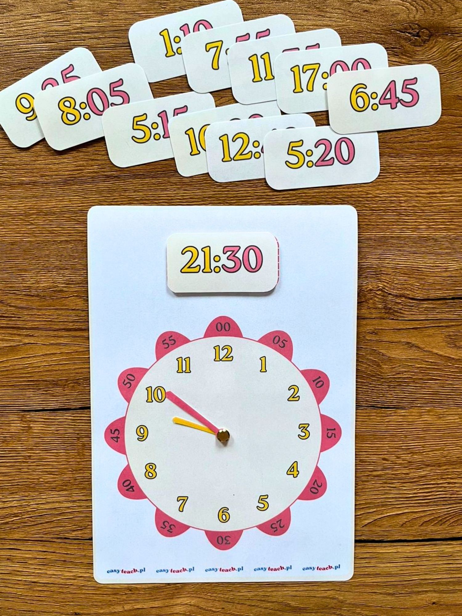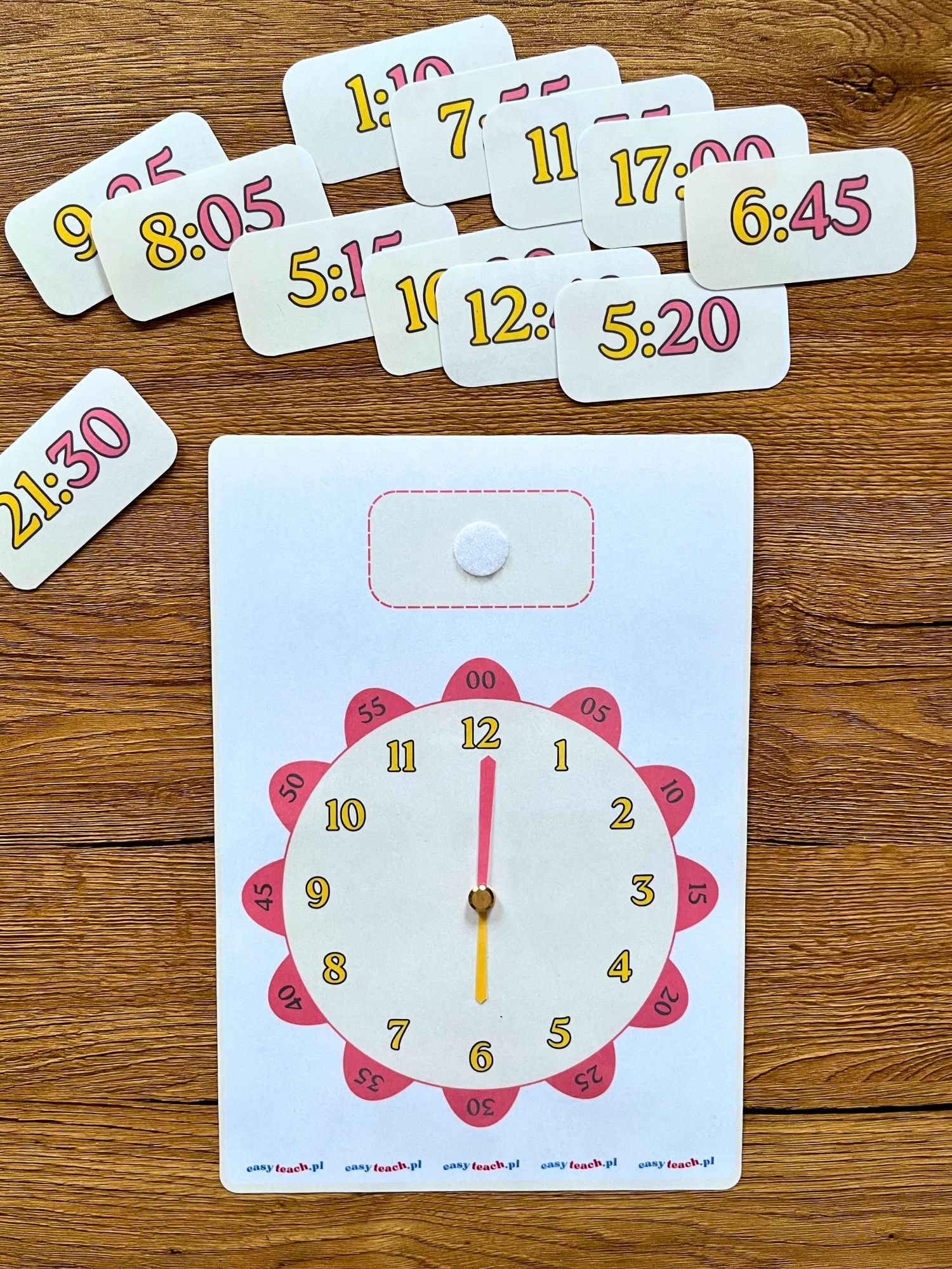 ➡️ Kolorowe karty z zaznaczonymi godzinami i minutami