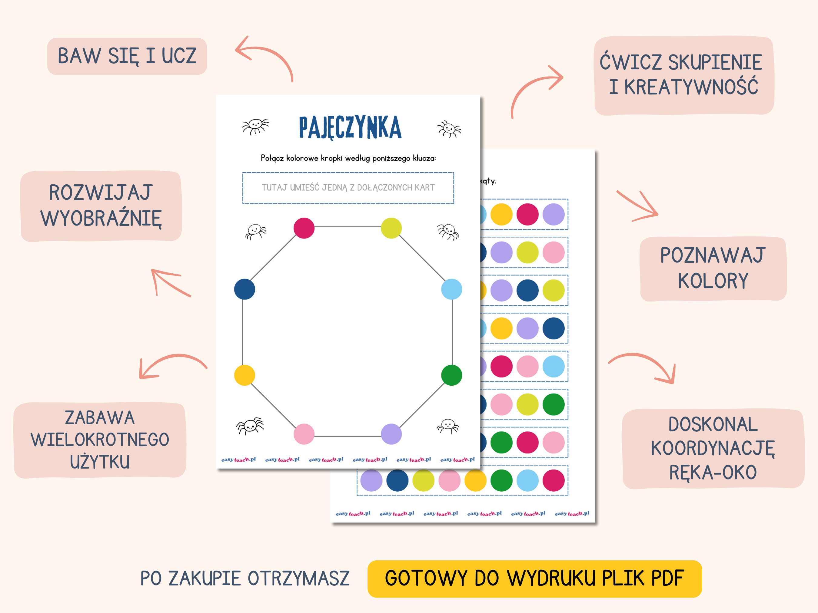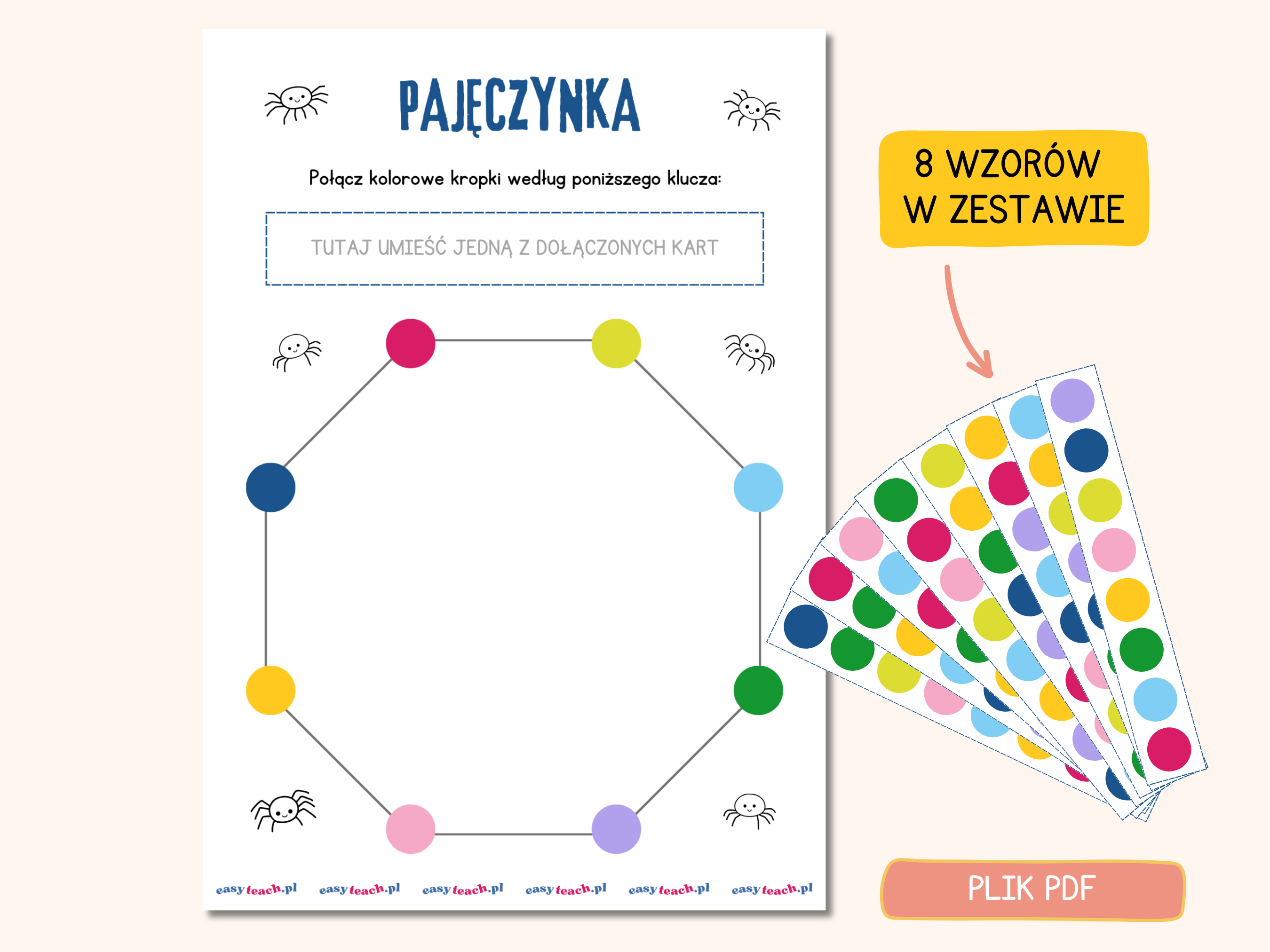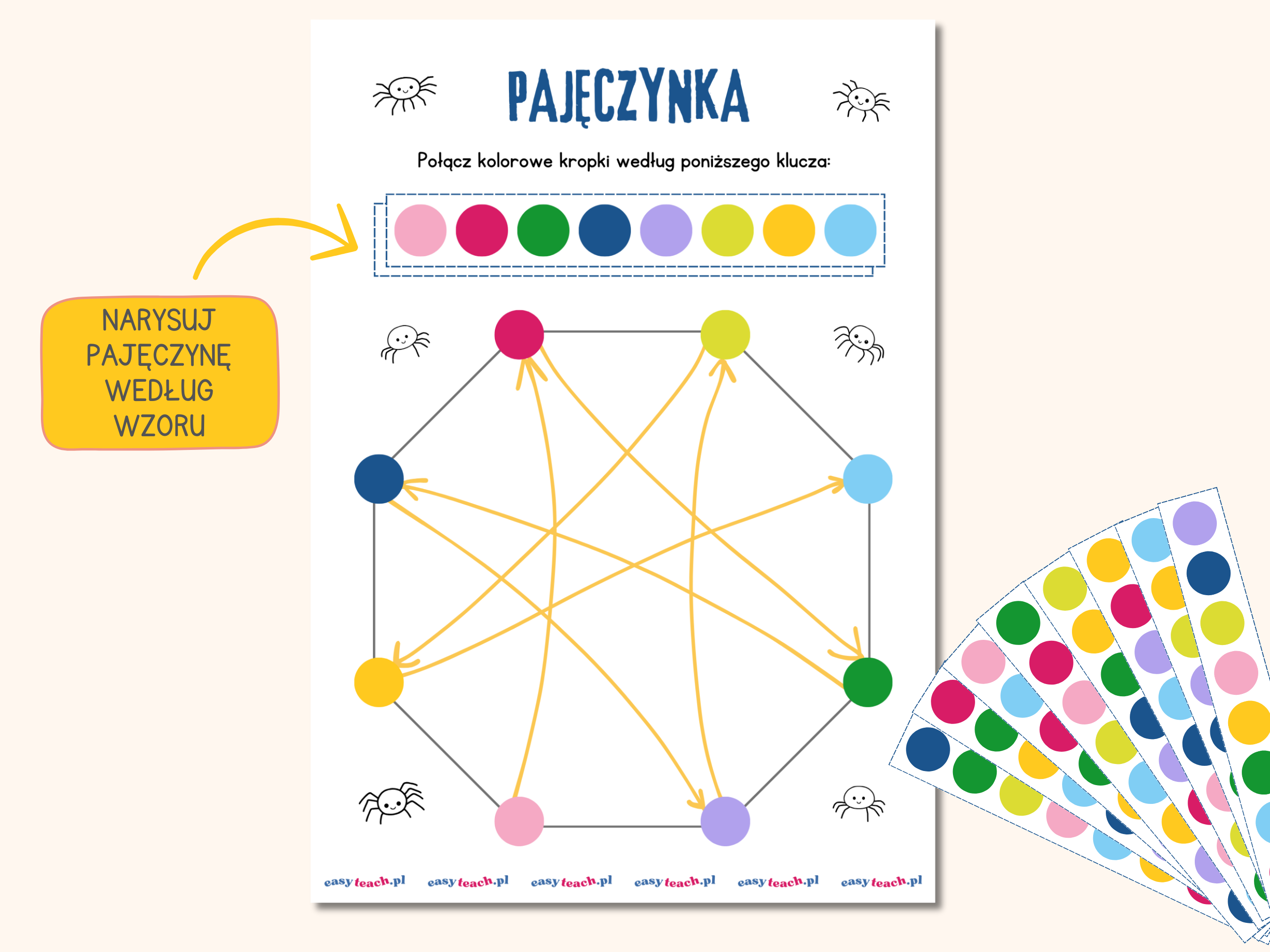 Połącz kolorowe kropki zgodnie z wybranym wzorem, tworząc barwną pajęczynę. Gra rozwija zdolności manualne, koordynację ręka-oko i ćwiczy koncentrację oraz wyobraźnię.