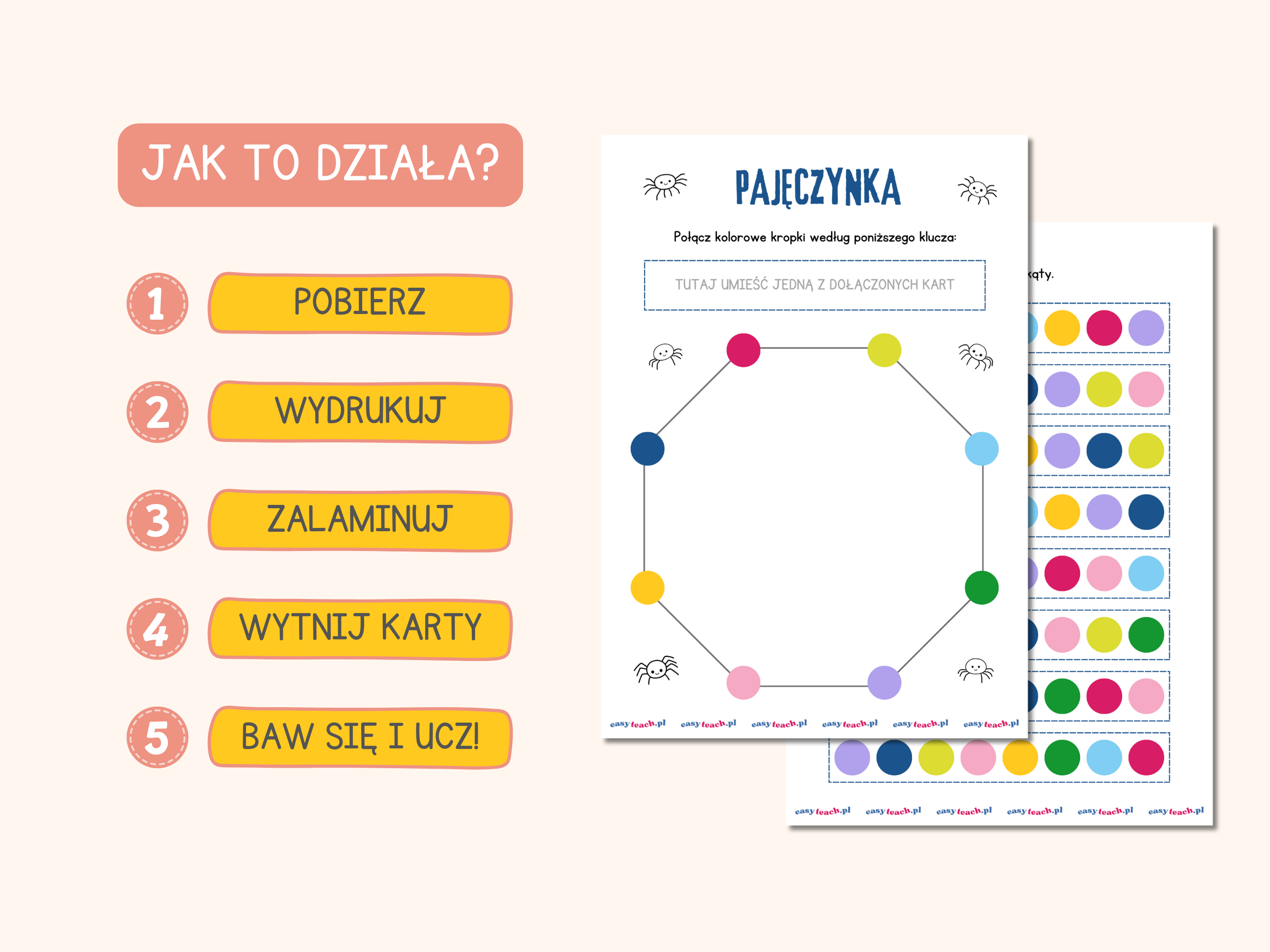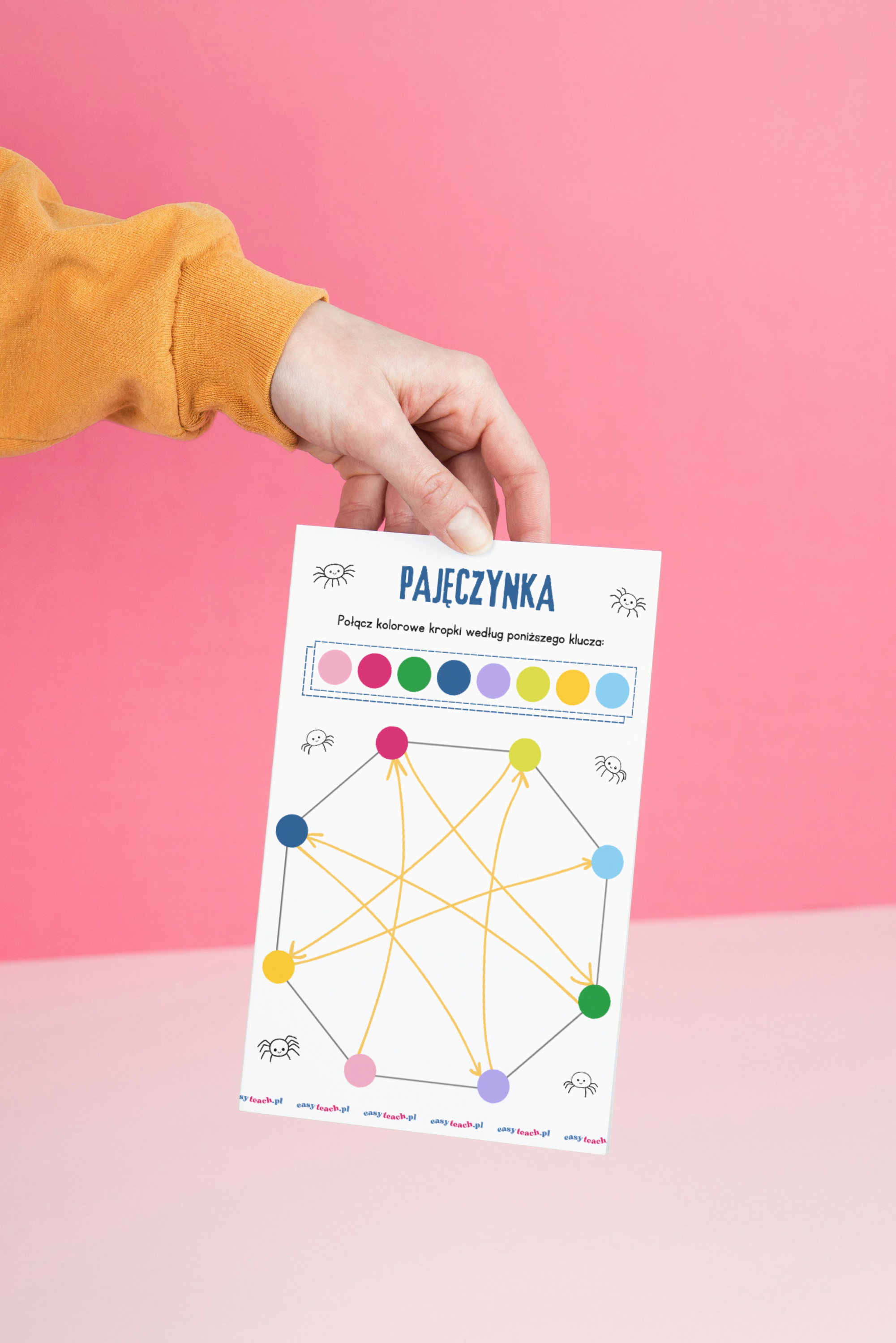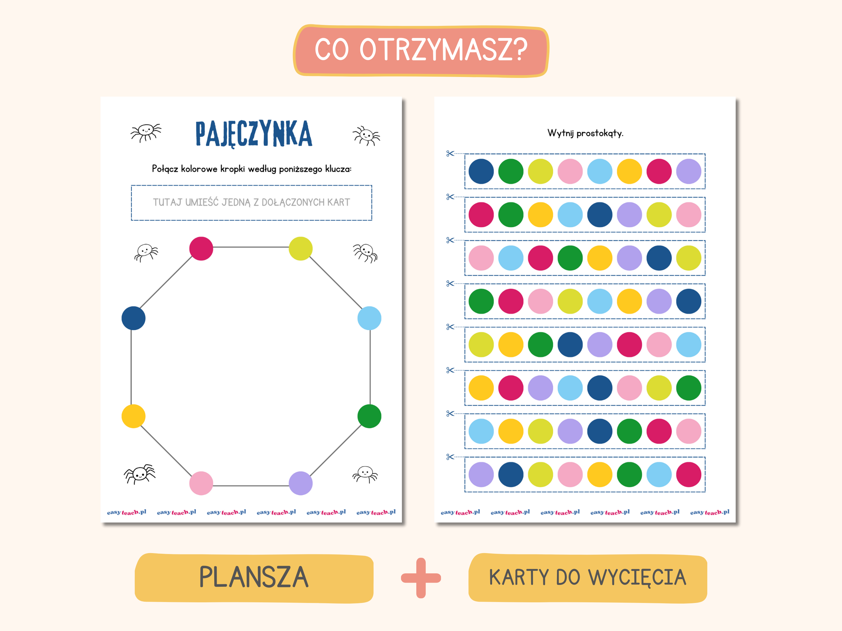 Połącz kolorowe kropki zgodnie z wybranym wzorem, tworząc barwną pajęczynę. Gra rozwija zdolności manualne, koordynację ręka-oko i ćwiczy koncentrację oraz wyobraźnię.